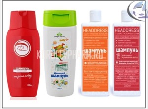 Примеры шампуней выпускаемых компанией ООО «КоролёвФарм»: мужской шампунь «Фанат», детский шампунь «Magic Herbs» и шампуни для роста волос «HEADDRESS»