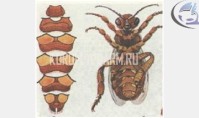 Получение и свойства. Пчелиный воск - продукт жизнедеятельности пчел. Он образуется специальными восковыми железами, которые являются разновидностью железистой ткани, вырабатывающей хитин — вещество, образующее наружный скелет (см.рис.1). Последние четыре полукольца брюшка называются стернитами и имеют так называемые восковые зеркальца (на рисунке более светлые). Зеркальце представляет собой участок хитина на поверхности брюшка. Под стернитами находятся клетки эпидермиса, вырабатывающие жидкий восковой секрет. Капли воска застывают и образуют на поверхности зеркалец восковые пластинки. Задними ножками восковая пластинка снимается и передается передним ножкам, затем пчела челюстями обрабатывает воск и использует его для постройки сот [7].