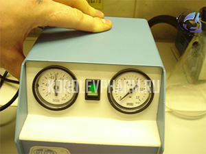 С помощью вакуум – насоса создаем в эксикаторе разрежение, которое контролируем по показаниям вакуумметра (рис. 5). Достигнув показаний на вакуумметре от 0,4 до 0,6 бар (рис.6), отключаем насос, с помощью клапана (рис.7) сбрасываем давление из эксикатора.